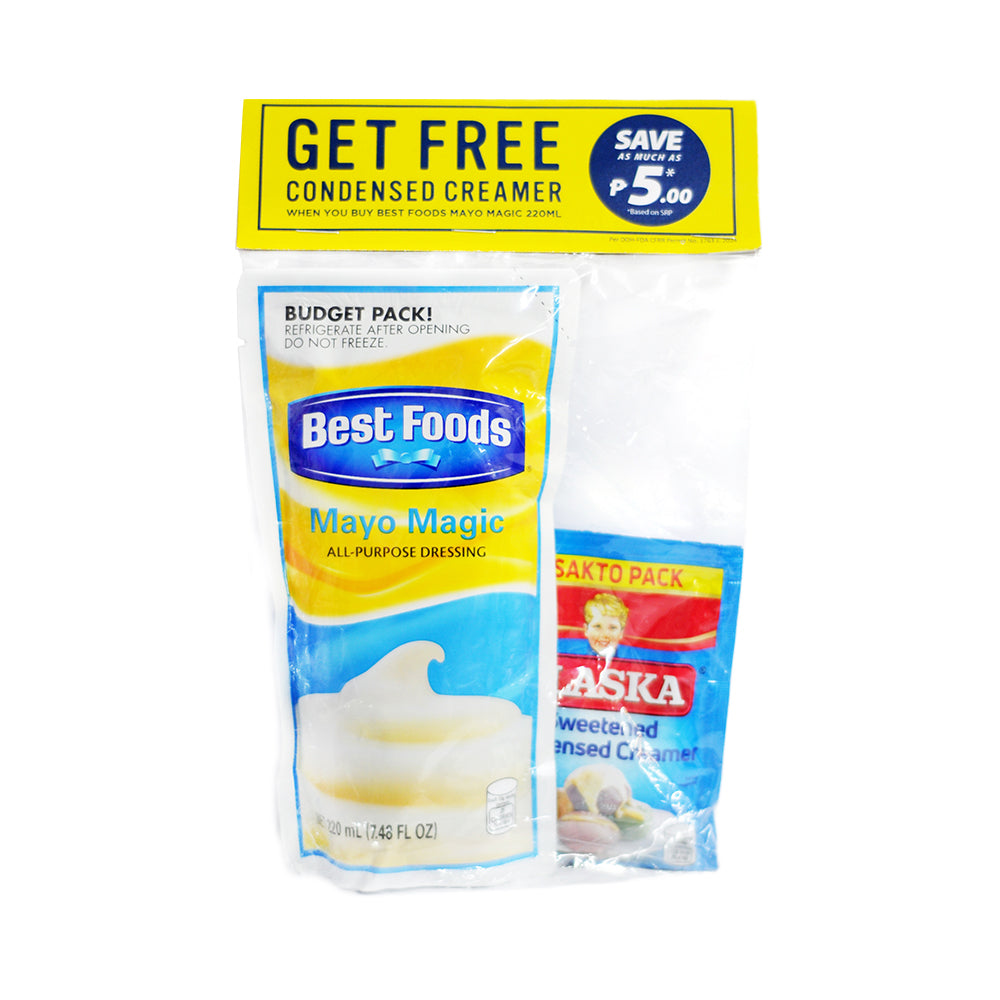 - Enhance your kitchen essentials with this convenient pack featuring Best Foods Mayo Magic Doy 220ml and Alaska Condensed Creamer Sakto Pack.