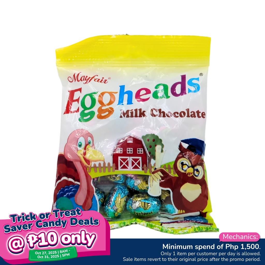 - Get these 25 pieces of Mayfair Eggheads Choco in one pack for only 10 pesos by following the mechanics below.