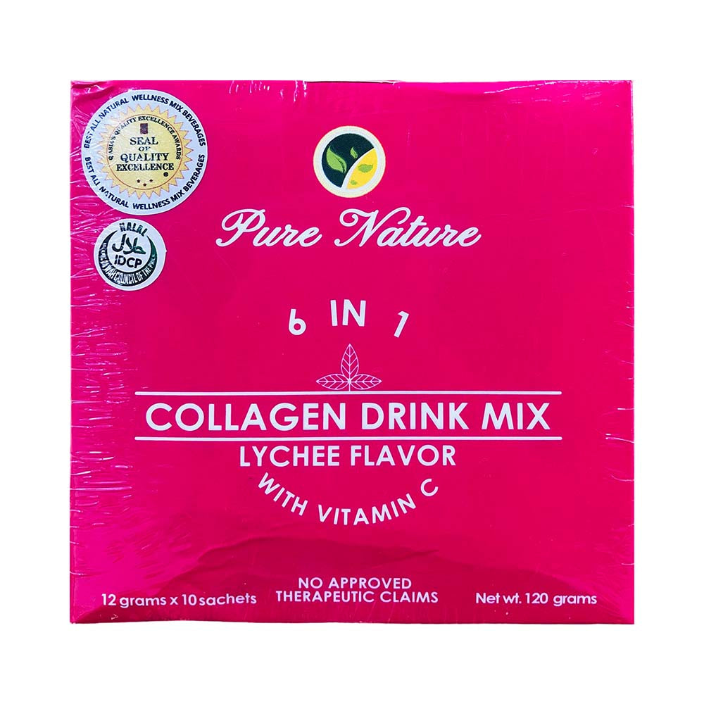 • Get 10 sachets (12 grams each) of Pure Nature 6 In 1 Collagen Drink Mix Lychee Flavor in one box.