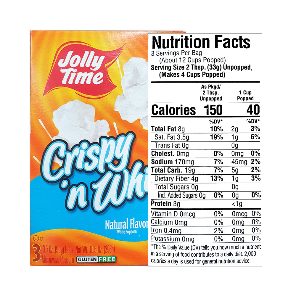 - 5oz of Jollytime Popcorn Crispy N' White Natural.