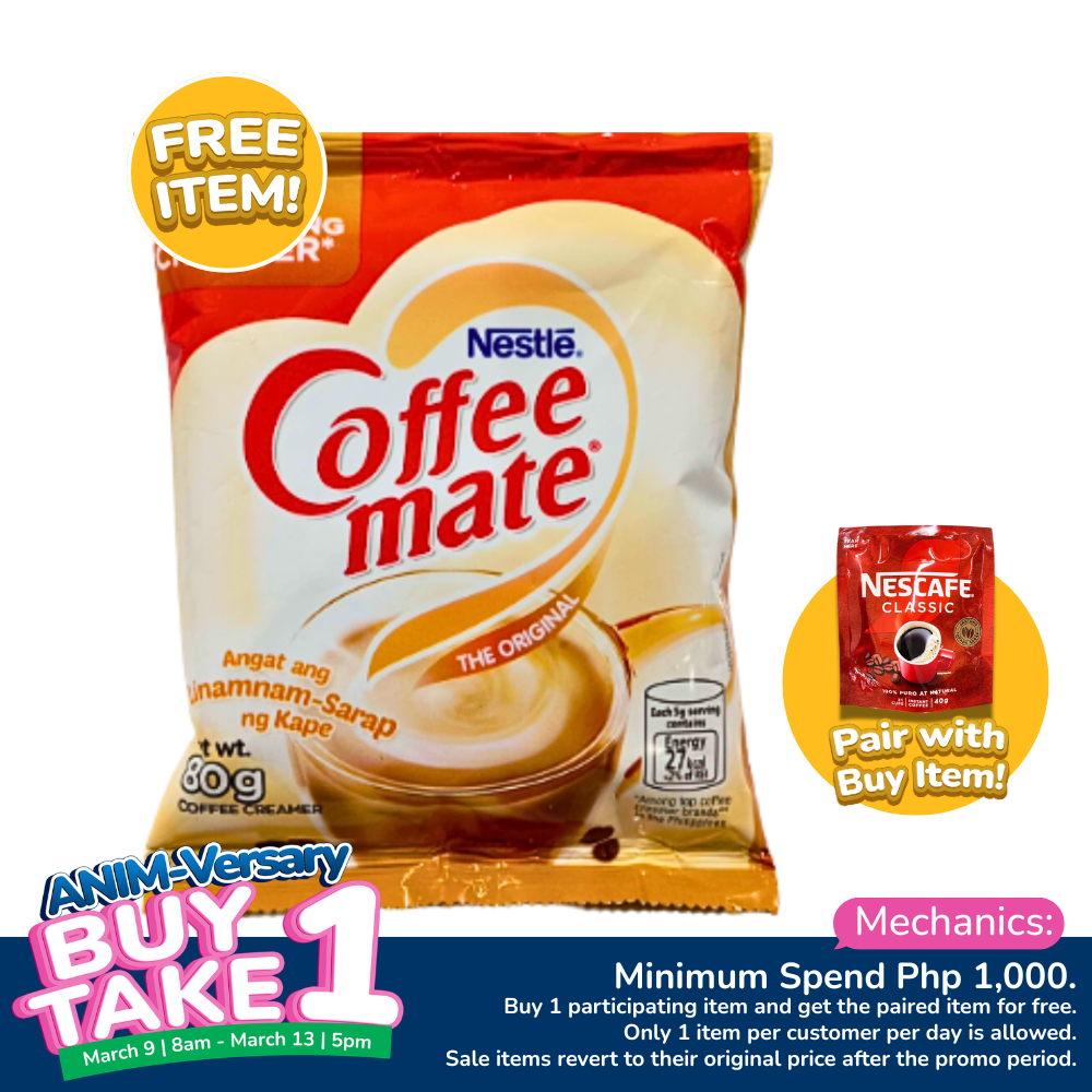 - Get this 1 pouch (80 grams) of Coffeemate Coffee Creamer for FREE when paired with the Buy item, following the mechanics below.