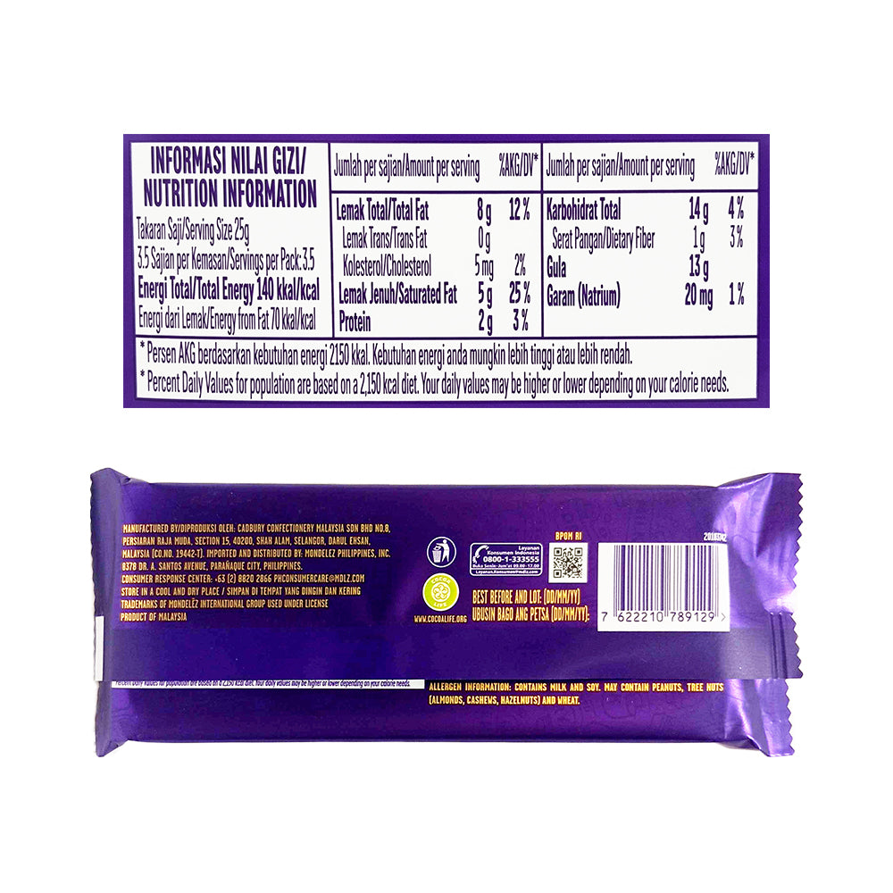 • Sold per 1 piece contains 85 grams of Cadbury Dairy Milk Chocolate.