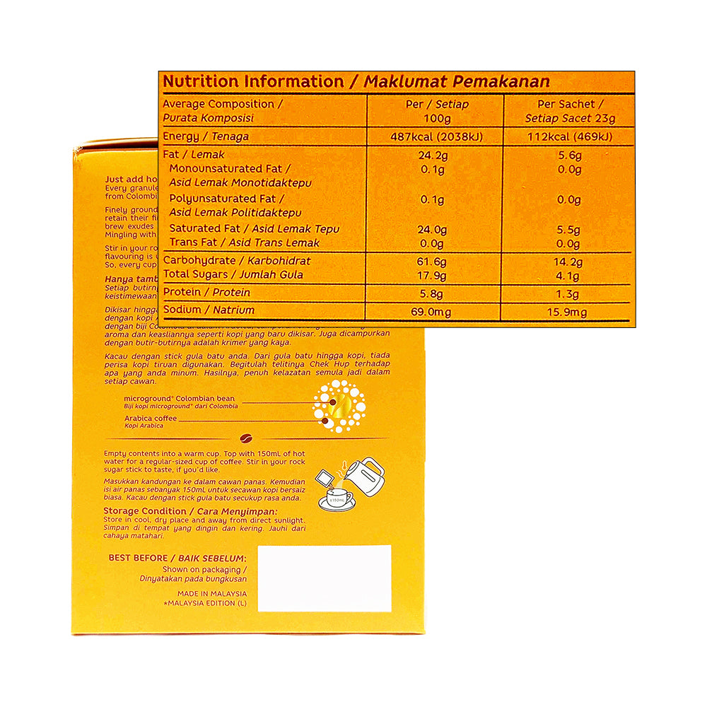 This pack contains 6 sachets, each containing 28 grams of Chek Hup Microground Colombian Latte.