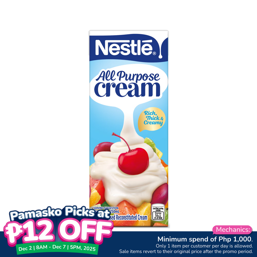 - Get this 1 pack (250ml) of Nestle All Purpose Cream and save 12 pesos by following the mechanics below.