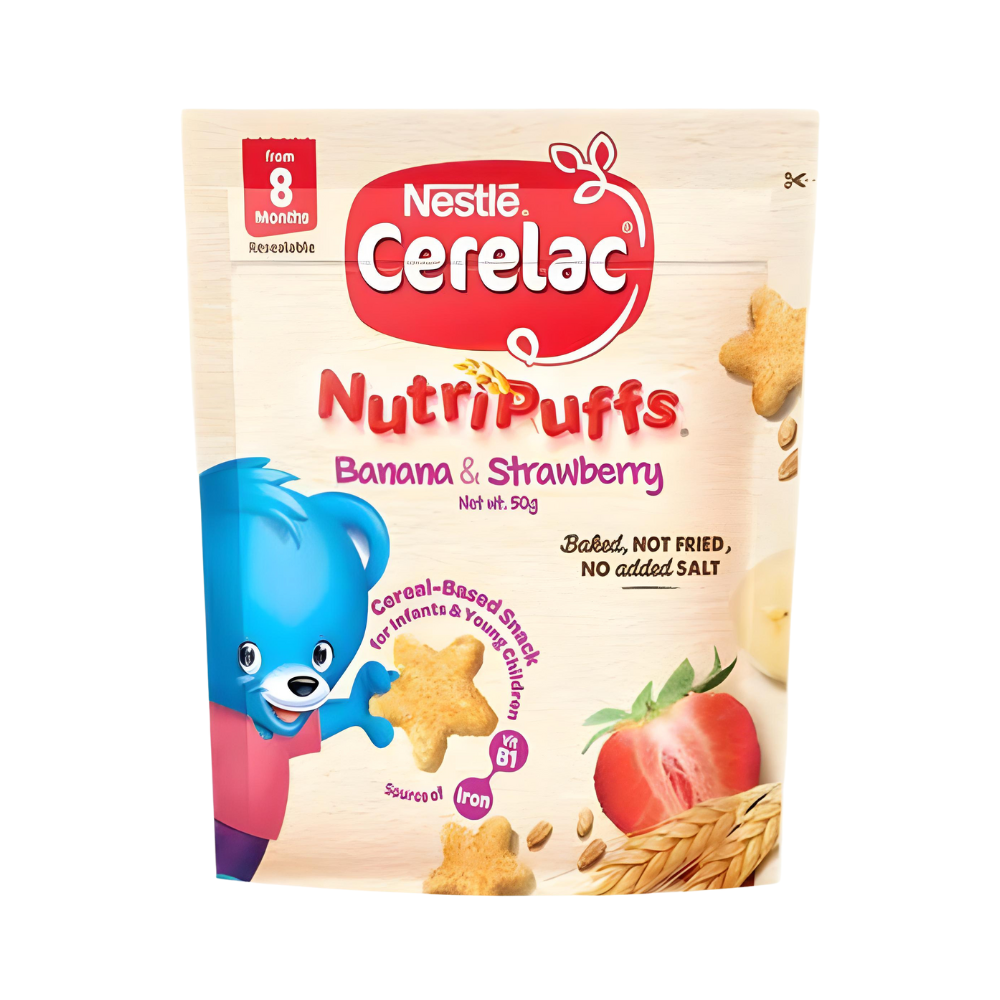 - Get this 1 pack containing 50 grams of Nestle Cerelac Nutri Puffs Banana And Strawberry.