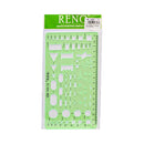 - Features a flat, transparent plastic with cutouts representing various electrical and mechanical symbols, shapes, and measurements.