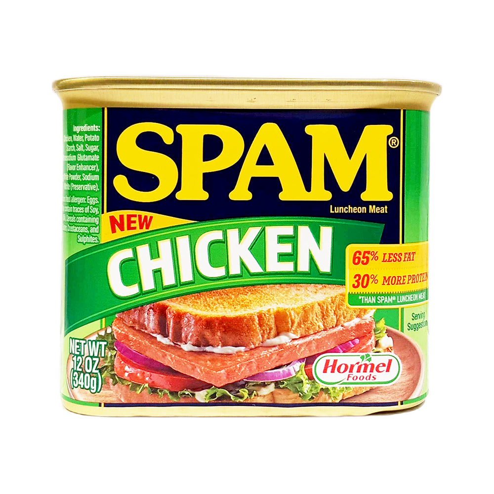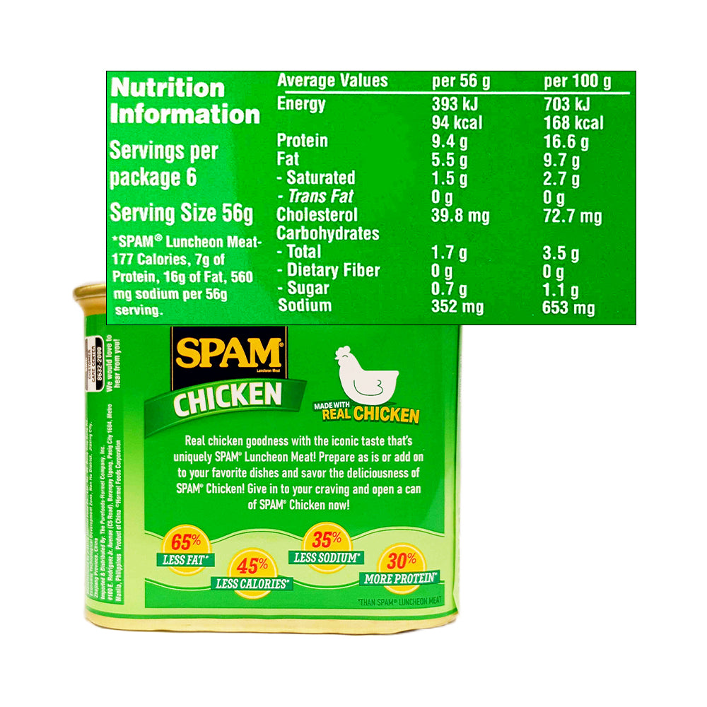 - Enjoy classic SPAM flavor with a lighter twist. SPAM Chicken – 65% Less Fat offers great taste and versatility for smarter everyday meals.