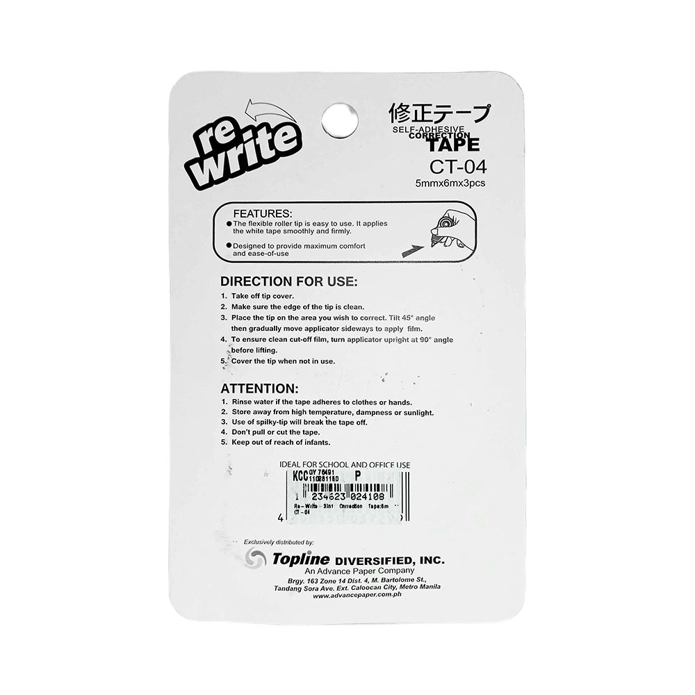 • Sold per 1 pack containing (3 pieces) of Re-write Correction Tape 6m.